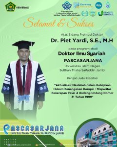 Jambi 09 April 2026 – Pascasarjana UIN Sulthan Thaha Saifuddin Jambi kembali menggelar sidang promosi doktor pada Program Doktor Ilmu Syariah dengan promovendus Dr. Piet Yardi, S.E., M.H., yang saat ini menjabat sebagai Kanit 1 Subdit 3 Tipidkor Ditreskrimsus Polda Provinsi Jambi. Sidang berlangsung khidmat dengan menghadirkan tim penguji dari unsur akademisi dan praktisi pemerintahan.