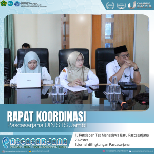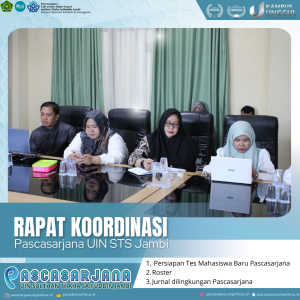 Jambi, 12 Agustus 2025 – Pascasarjana Universitas Islam Negeri (UIN) Sulthan Thaha Saifuddin Jambi menggelar rapat koordinasi pada Selasa (12/8/2025) bertempat di Ruang Rapat Pascasarjana. Kegiatan ini berlangsung sejak pukul 08.30 hingga 10.30 WIB dan dihadiri oleh pimpinan, staf akademik, dan tim pelaksana kegiatan Pascasarjana.