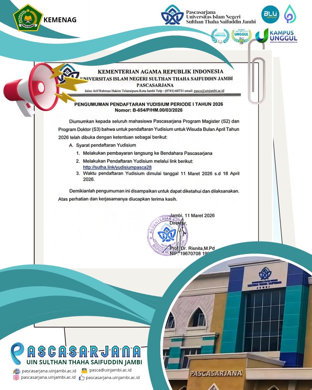 Pendaftaran yudisium pascasarjana tahap 1 2026 dimulai tanggal 11 maret s/d 18 april 2026.
